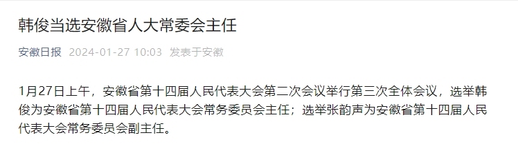 据安徽日报微信公众号消息,1月27日上午,安徽省第十四届人民代表大会第二次会议举行第三次全体会议,选举韩俊为安徽省第十四届人民代表大会常务委员会主任;选举张韵声为安徽省第十四届人民代表大会常务委员会副主任。(记者:范孝东朱胜利李明杰)