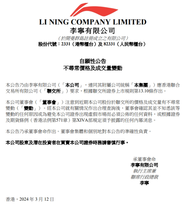 李宁公司在港交所公告,注意到近期本公司股份于联交所的价格及成交量有不寻常变动,董事会确认其并不知悉该等变动的任何原因或为避免公司证券出现虚假市场而必须公布的任何资料。